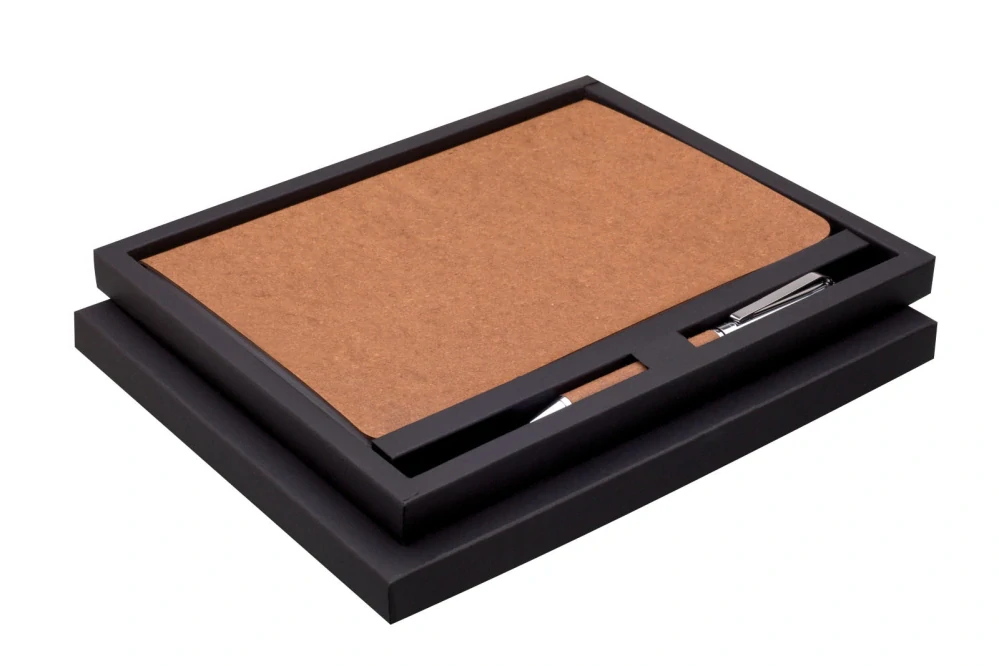 Poznámkový linajkový zápisník CASTEL v doskách z recyklovanej kože, s kovovým perom v čiernej darčekovej krabičke. Kolekcia SAVE THE NATURE. 80 linkovaných listů