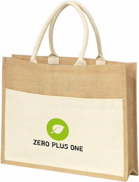 Jutovú nákupná taška s otvoreným hlavným priestorom, malým vreckom a nosnou dĺžkou uší 26 cm. Juta.