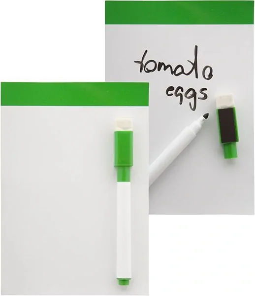 Biela magnetická tabuľka s rozmerom 10 x 15 cm má farebný pásik na hornom okraji a v rovnakej farbe je aj viečko plastového popisovača, na ktorom je čistítko pre čistenie tabuľky. Popisovač aj čistítko sú magnetické a držia na kovových plochách.