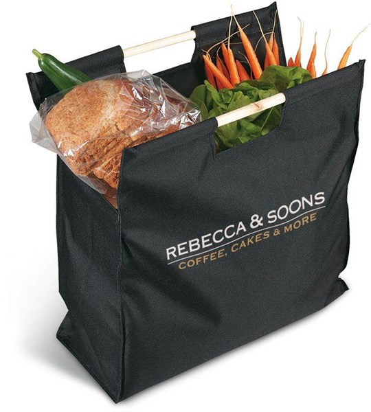 Polyesterová taška s drevenými rúčkami, čierna Polyesterová nákupná taška s drevenými rúčkami na držanie.