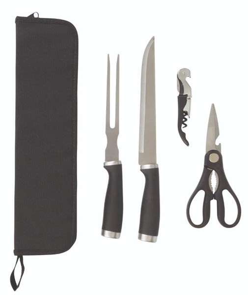 Sada z nerez ocele uložená v nylónovom obale na zips obsahuje 4 diely: nôž, vidlička na mäso, nožničky a vývrtka. Potlač je možná transferom na obal, tampoprintom na nástroje.