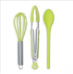 Súprava kuchynského náradia, balené v čiernom darčekovom boxe, obsahuje metličku na šlahanie, PU lyžicu a kliešte