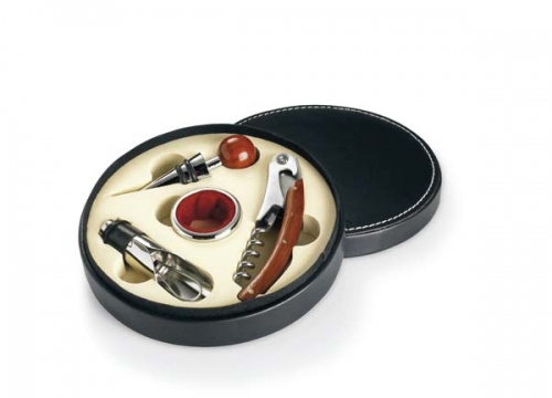 Súprava na servírovanie vína v okrúhlom obale, čašnícky nôž, zátka, krúžok na fľašu