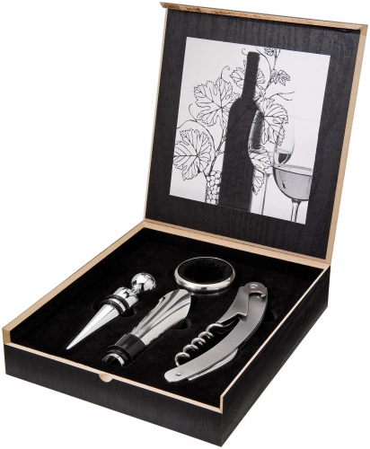 Súprava na víno 4ks, čašnícky nôž, zátka, lievik, ochranný krúžok na hrdlo fľaše v darčekovej kazete.